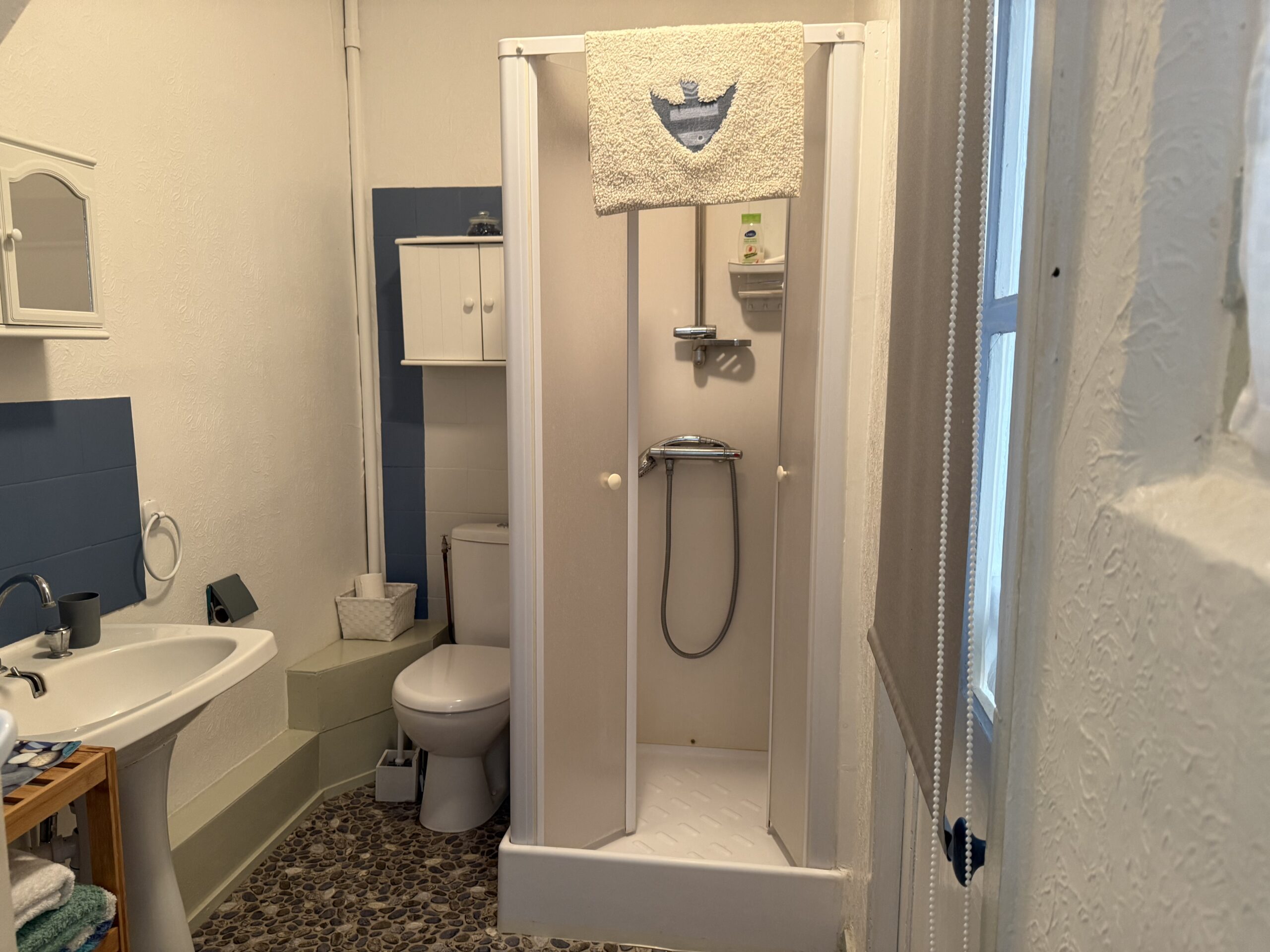 – Au rez-de-chaussée : d’un séjour avec cheminée (poêle à bois) ouvert sur cuisine, placard et petit cellier sous escalier ;